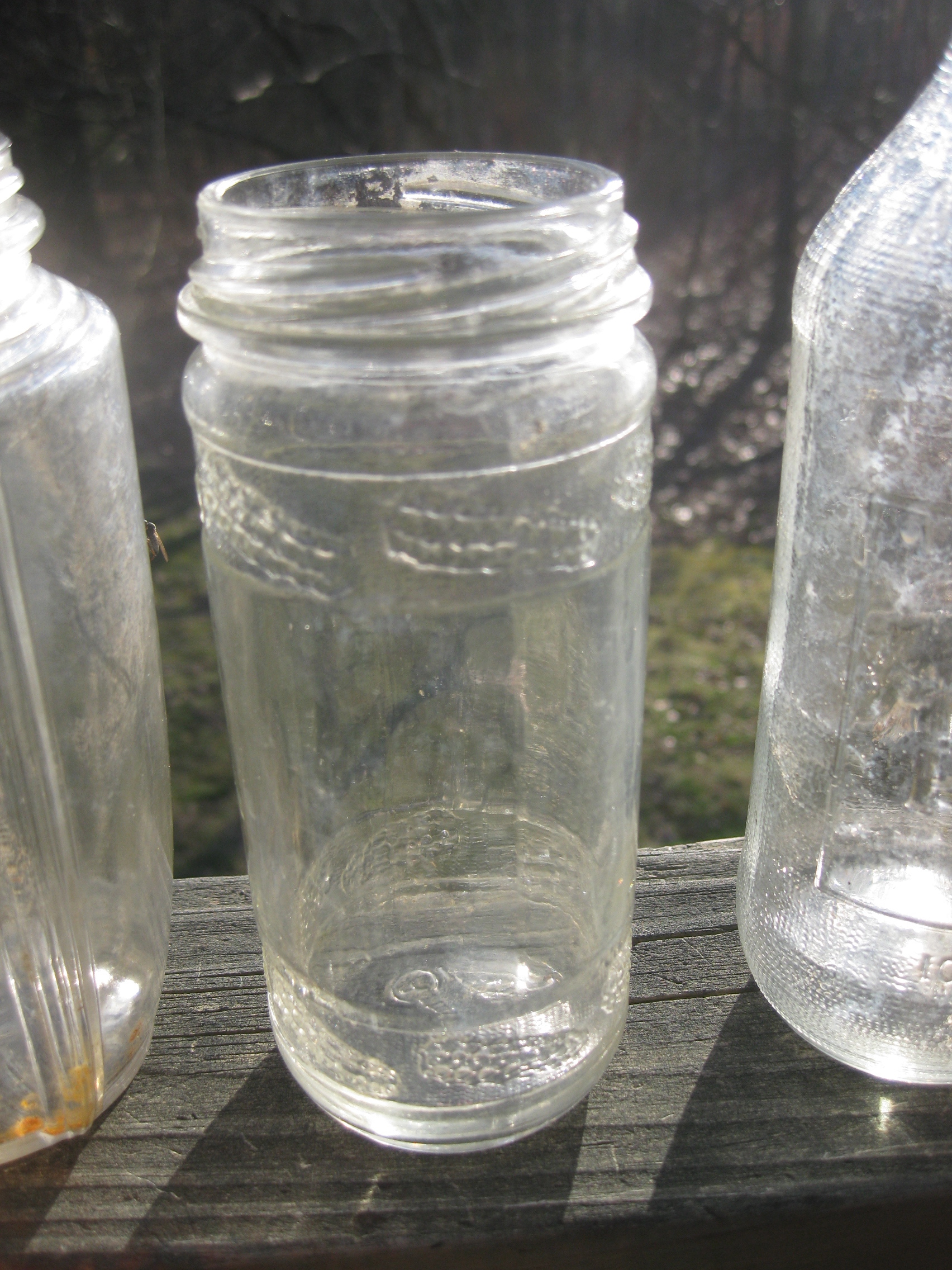 Let me share a few pictures of glass bottles and jars that the boys and I have found in the woods in the past few weeks. I am not making any special claims about the uniqueness of their design or the rareness of their types. All I’m saying is that there they were, ready to be picked up, small reminders of the days when the wilderness behind the house seemed the right place to cast away the excess things of this world. My bottles and jars are, each in their own way I think, “foster-children of Silence and slow Time.”