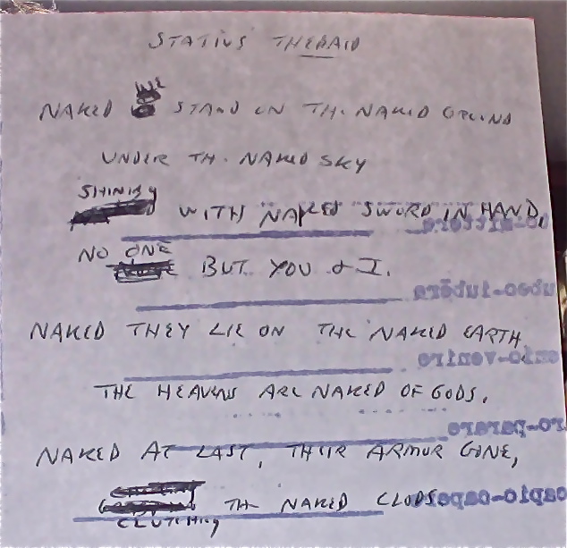 I have been cleaning out my office and found this item among some papers I had inherited when I became chair.  It is poem about Statius’ Thebaid by my former colleague and well-loved Sewanee Classics professor, Bill Bonds.  It is scrawled on the torn-off corner of an old mimeographed quiz.