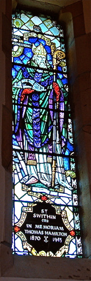 So far, the saint is doing right by us, but there’s plenty of time left in the day for him to screw this up. Swithin was a bishop of Winchester, only an hour or so’s drive from Oxford, and is venerated there particularly in the famous cathedral. Closer to home, there’s a girl’s school called St. Swithin’s in Oxfordshire and a quad named for him at Magdalen College, which I have not now seen. Interestingly enough, the image I know best of this saint is in All Saints’ Chapel back in Sewanee (pictured to the left). He’s holding a bridge, his traditional iconographic attribute, to represent the bridge he ordered built over the River Itchen and where he performed a miracle. Why this entitles him to represent “Civil Engineering,” as the window states, is beyond me, but then, Sewanee hasn’t had a department of civil engineering for a long time, if ever, so it’s probably just as well.