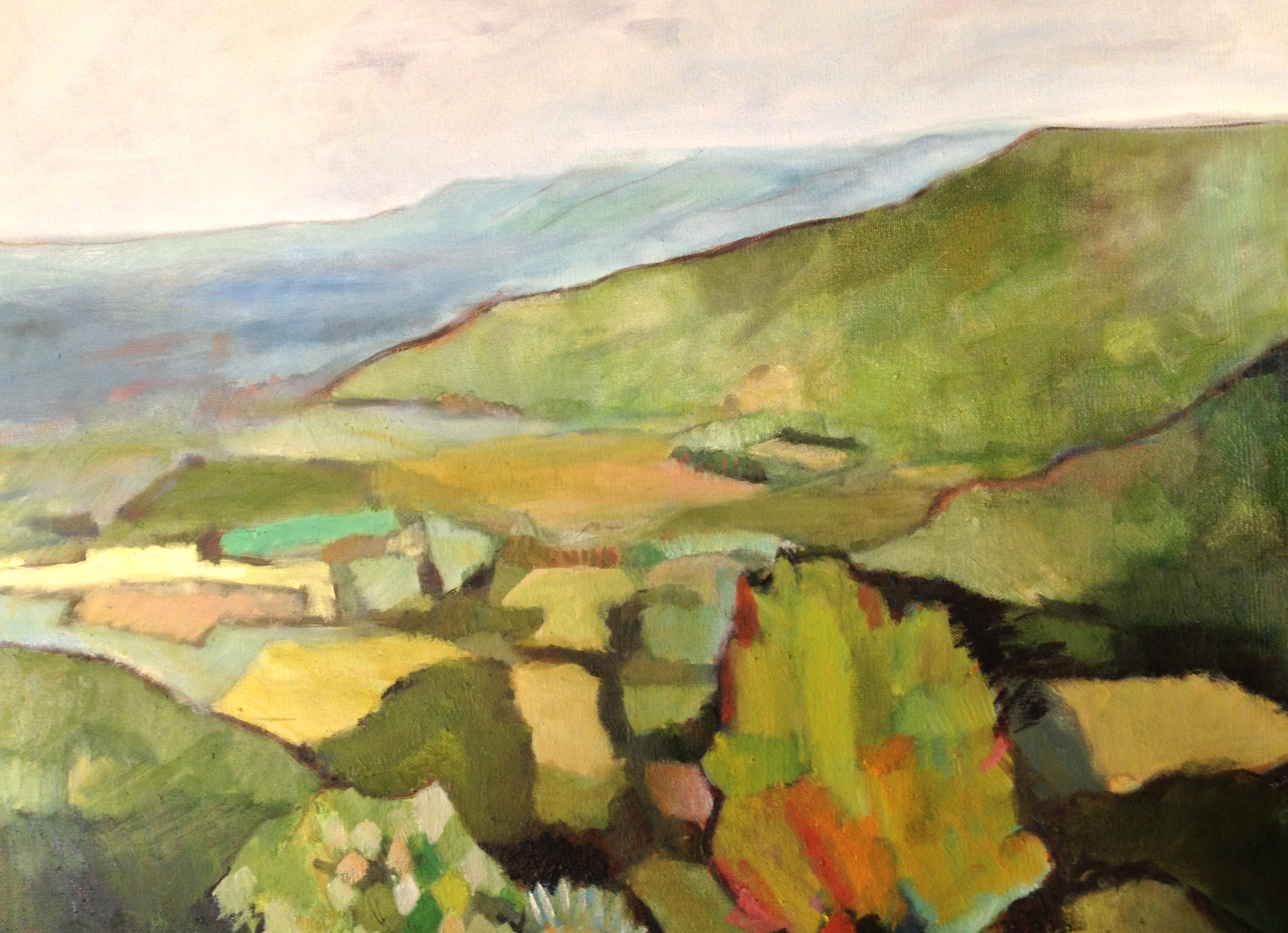 The first time my wife and I looked out from Green’s View in Sewanee, she said, “It looks like the original cover of The Fellowship of the Ring.” She was right, of course, in more ways than one. Sewanee has always had a feel of the Shire about it, a kind of remove from the workings of the rest of the world that we usually associate with the pastoral. As William Alexander Percy famously described Sewanee, It’s a long way away, even from Chattanooga, in the middle of woods, on top of a bastion of mountains crenellated with blue coves. It is so beautiful that people who have once been there always, one way or another, come back. For such as can detect apple green in an evening sky, it is Arcadia. The painting below of Green’s View was done last year by Dan Pate, whom I think of as Sewanee’s Cézanne– the dreaminess of the landscape done in abstract design capture much of what I see from this prospect.