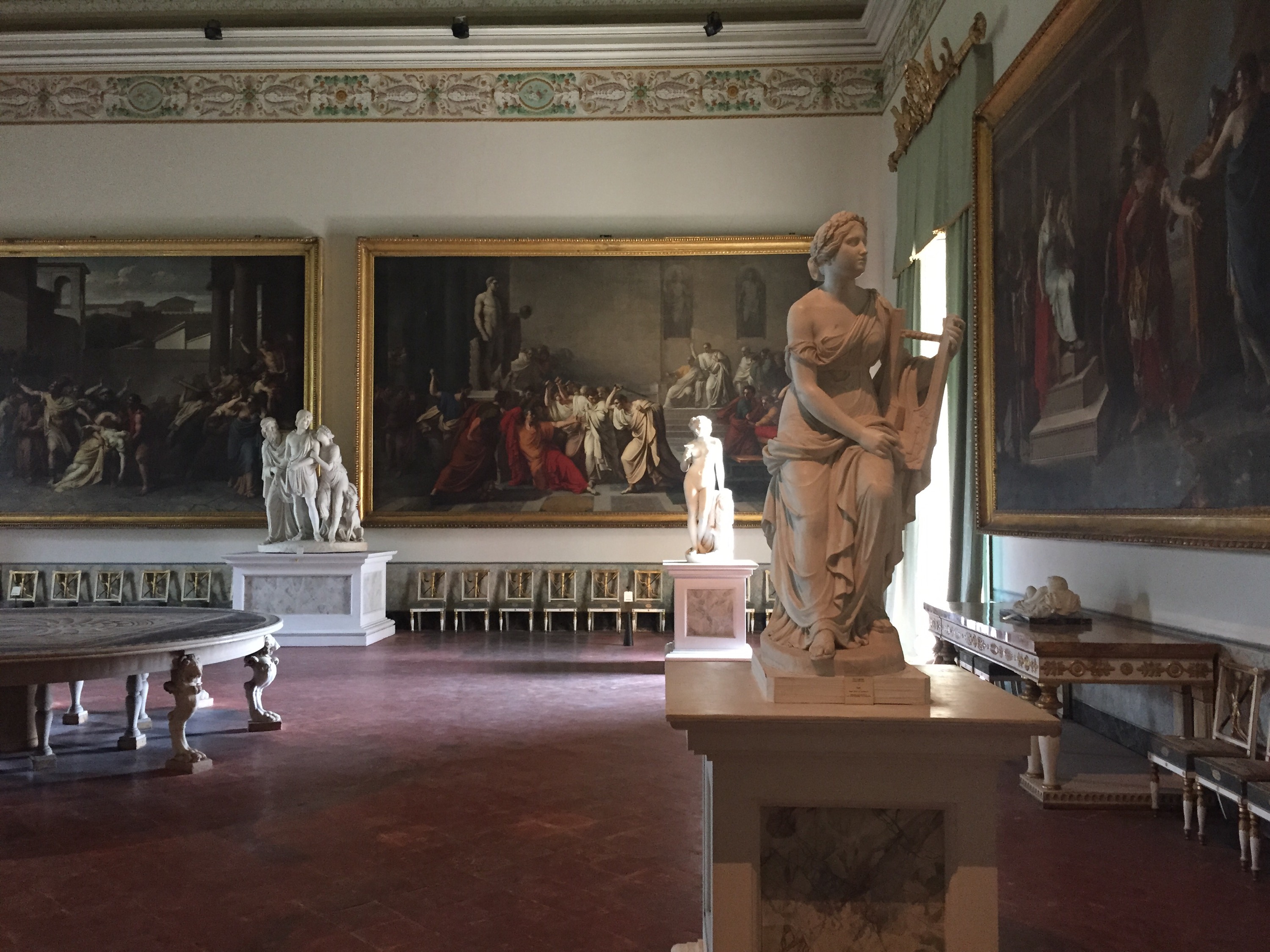 Its been a long day in Naples, up to the Capodimonte museum, to see some incredible works of art– although the air conditioning was out! So, a museum full of masterpieces in 90 degree heat. Some amazing pieces though, including Artemisia Gentileschi’s self portrait as Judith cutting off Holfernes’ head. Sometimes coming across a painting is like seeing a celebrity. It was thrilling. Titian’s Danae is here. Also, Camuccini’s Death of Julius Ceasar in situ is remarkable. We couldn’t go into the room, but the table actually has a mosaic from Herculaneum in corporated into its top! Lets not even talkbabout the room mafe entirely of porcelain.