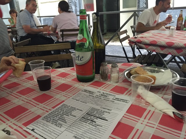 The Trattoria da Nennella is where I am right now having dinner, a crowded street trattoria in the Spanish Quarter that happens to have Wifi. A few minutes ago, someone set off fireworks a hundred feet away–everyone ducked or ran. Is it gunfire? The waiter laughed and continued to take our order, writing it out on the tablecloth. I’m thinking I need one of their shirts. The cernia Jacjie ordered was excellent, my breaded cutlet serviceable. By the way, “friarelli” apppears to be collard greens though less bitter. (Ah, checking later, I see it’s Neapolitan dialect for broccoli raab). Later in the evening, they all even started to sing– see video below.