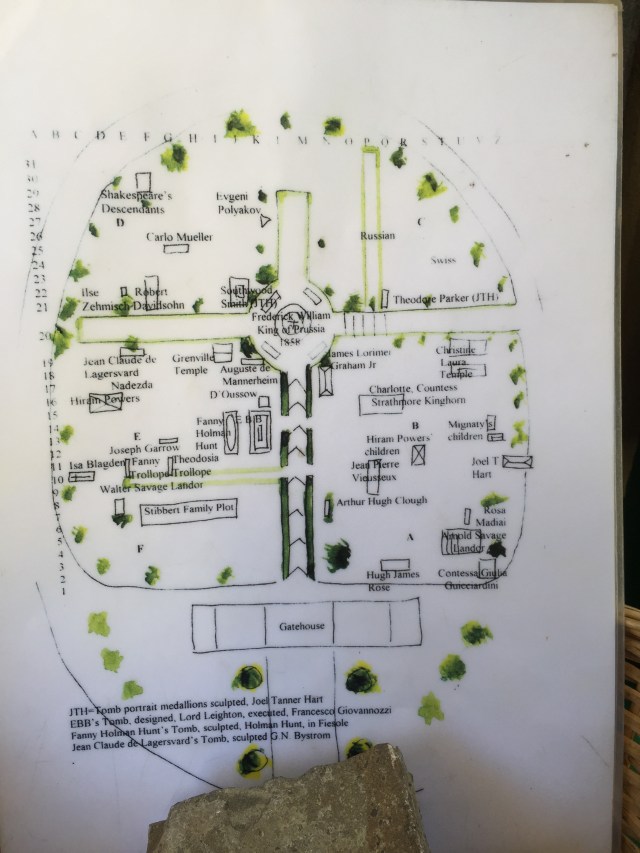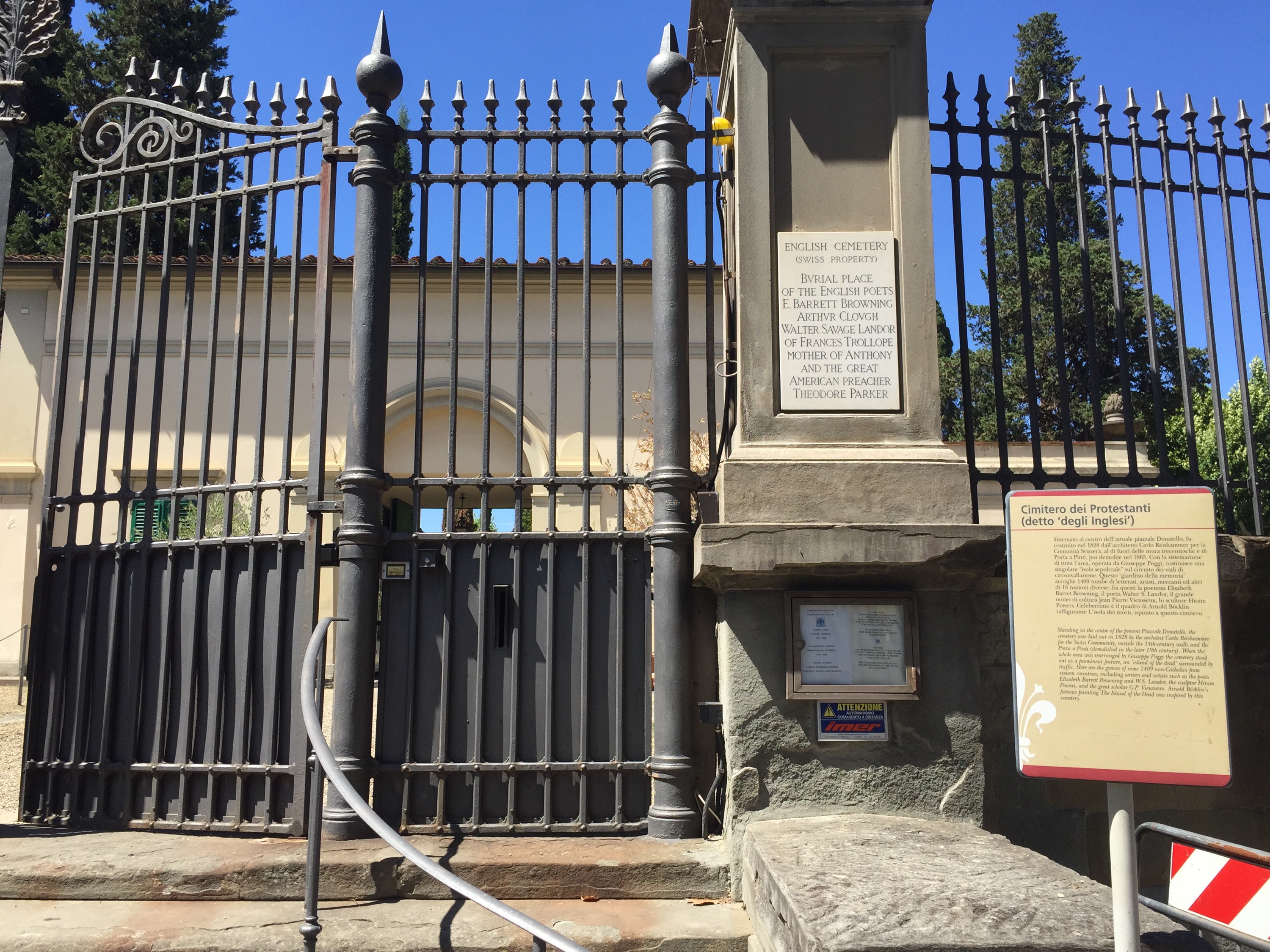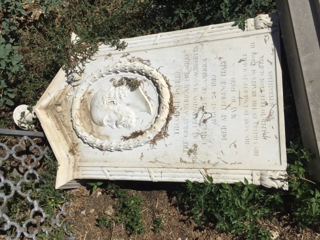 I went up to the English Cemetery on Piazzale Donatello this afternoon to look at the tombstone of Theodore Parker. It’s a bit of a misnomer, Cimitero Inglese, as it’s really a graveyard for Swiss Protestants. But it is the final resting place of numerous Anglo-American ex-pats, like Robert and Elizabeth Barrett Browning, Henry Adams, Margaret Fuller, and the person I was looking for, Theodore Parker.