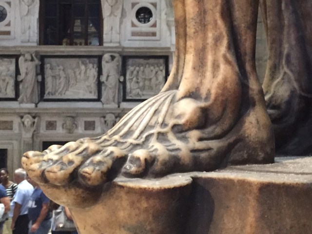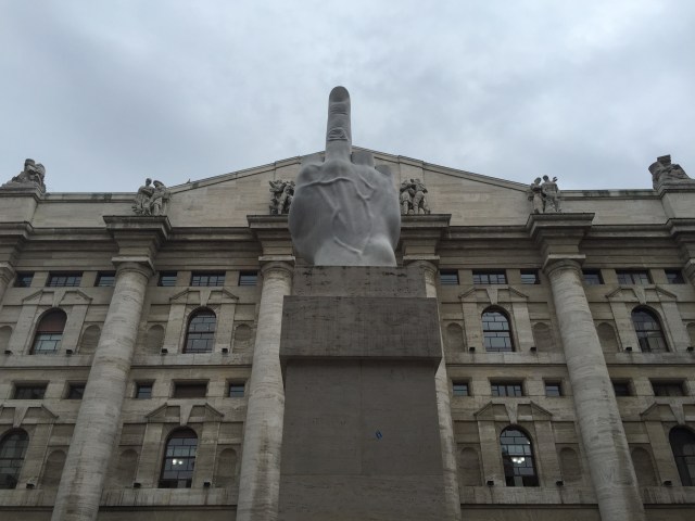 Having done due diligence in seeing the Dupmo, I rushed on over to the Borsa to see Maurizio Cattelan’s L.O.V.E. (Liberté, Ofio, Vendetta, Eternità).I had written a post on this before, but had not seen it in the flesh, so to speak. An enormous hand recalls Constantine’s hand in Rome, of course–so an indictment of power–but also Adam Smith’s invisible hand–an indictment of the free market. People complain about the difficulty of modern art, but as a commentary of la crise in 2008, it could not be more clear. In its own way, it’s a caution against the things of this world.