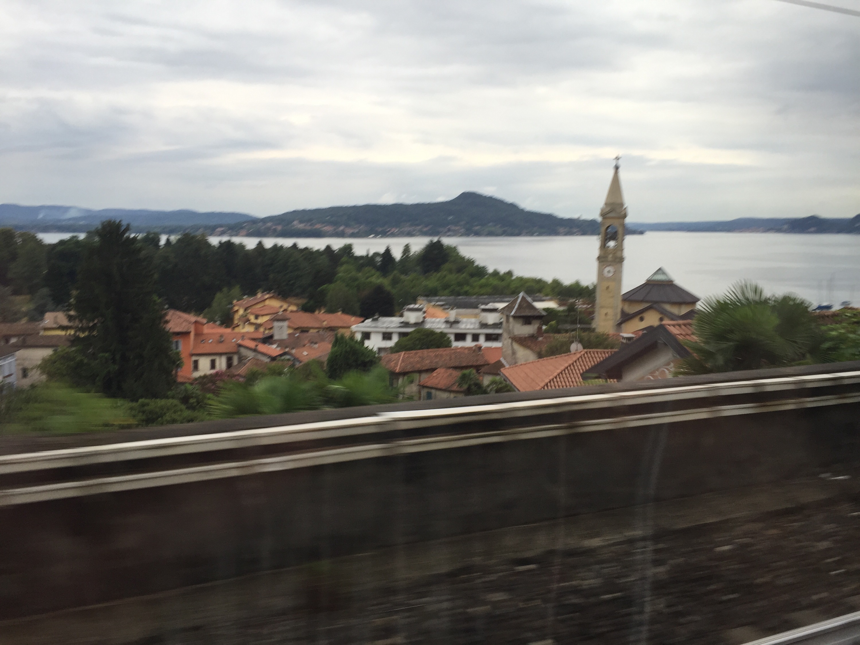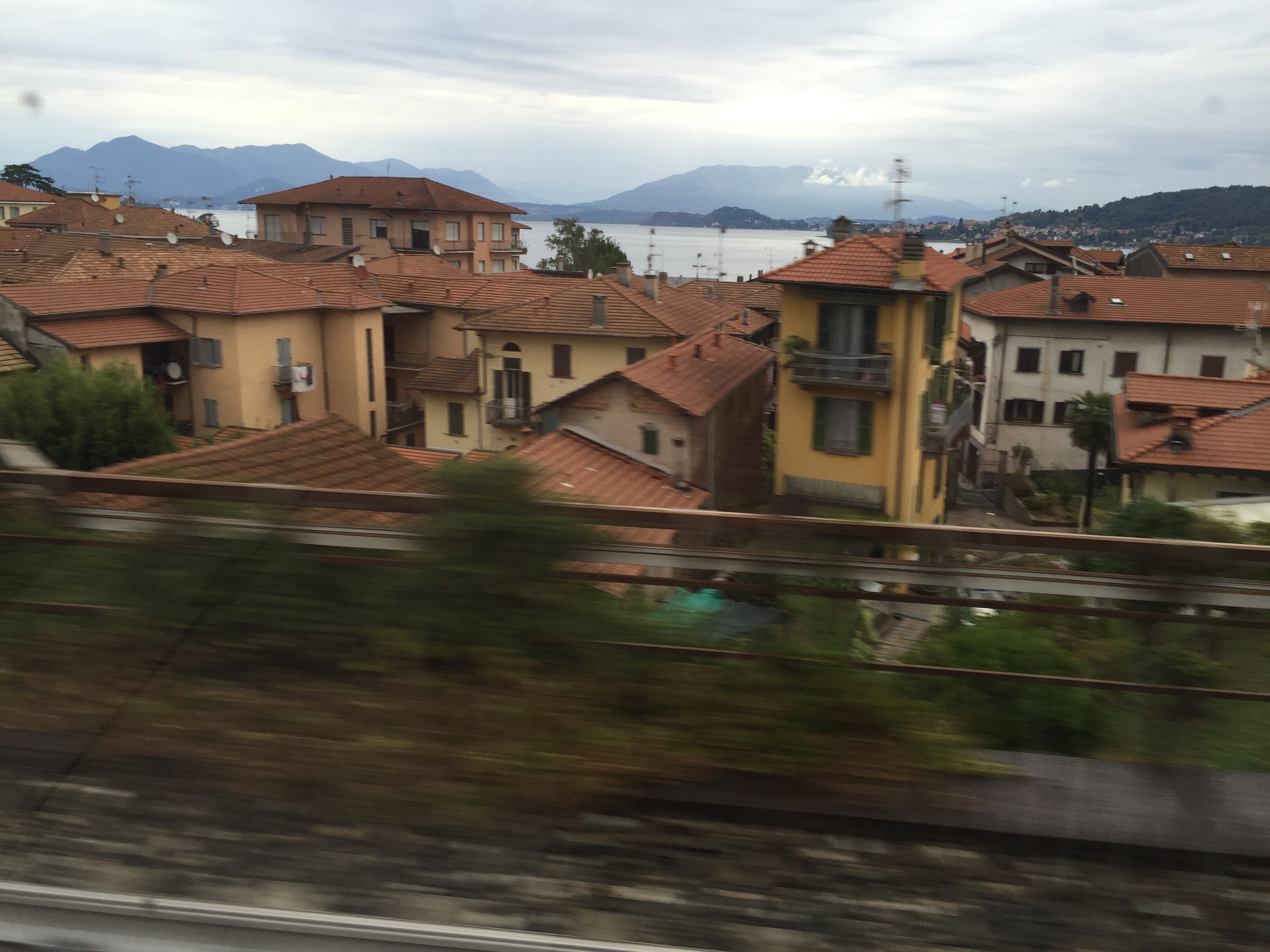 When I think about it, there are two pictures that I regret missing during this part of the journey. The first was the result of bad planning–I had hoped, in passing along Arona, I might catch a glimpse of the Colossus of San Carlo, the massive hollow bronze statue from the 1600’s that was the inspiration for the Statue of Liberty. For some reason, I thought it would be on the lake to my right, when in fact it was on a hill overlooking the lake to my left. He was a dour old moralist, but I would have liked to see the giant statue of St. Charles Borromeo. I’m sorrier, though, about the little girl, little more than a toddler, waving frantically to the train from the backporch of an apartment building along the tracks. Eventually the trains will be a routine matter for her, no doubt, but for now she was excited to see one rumble on by. That’s a picture I wish I had.