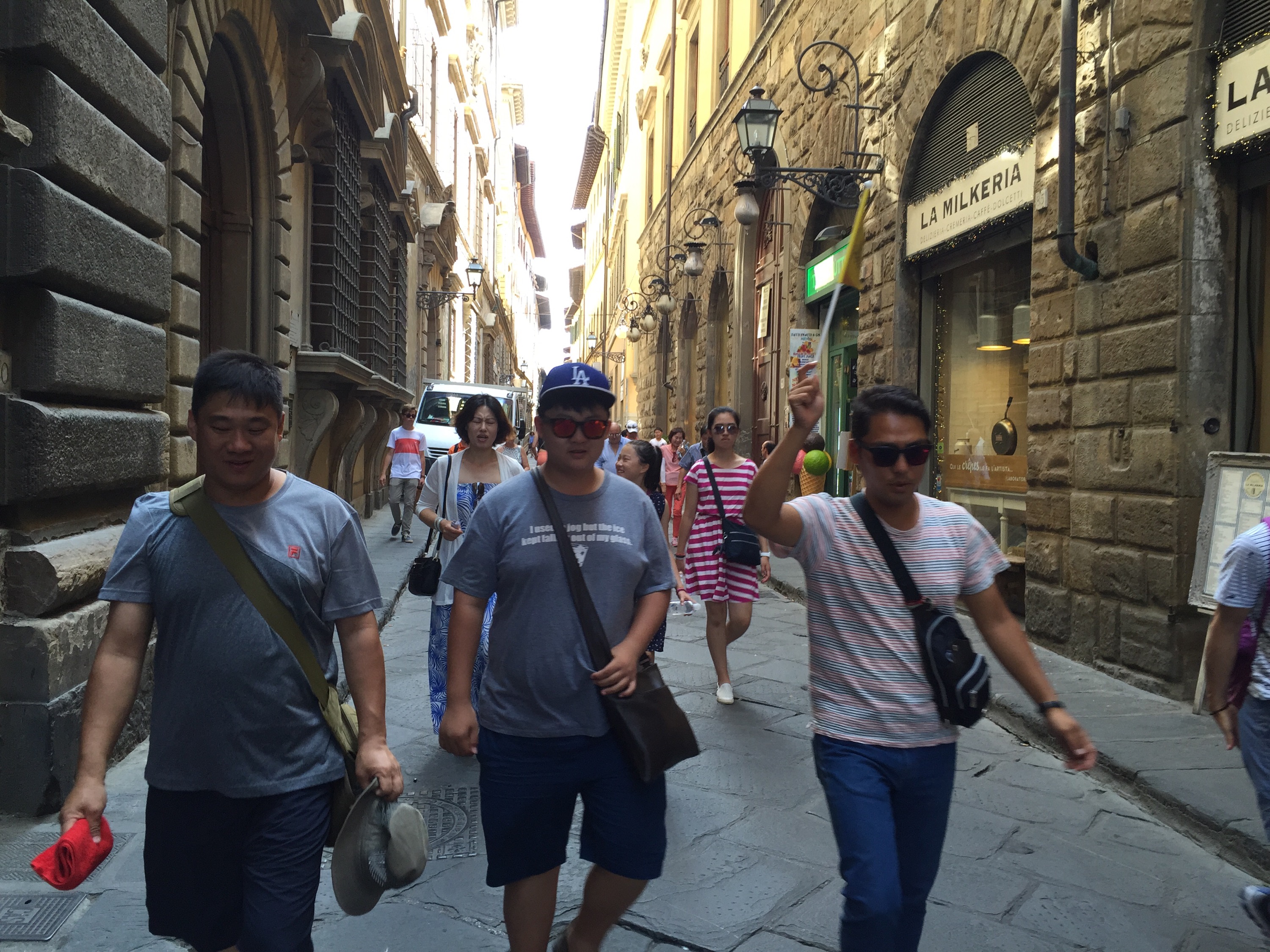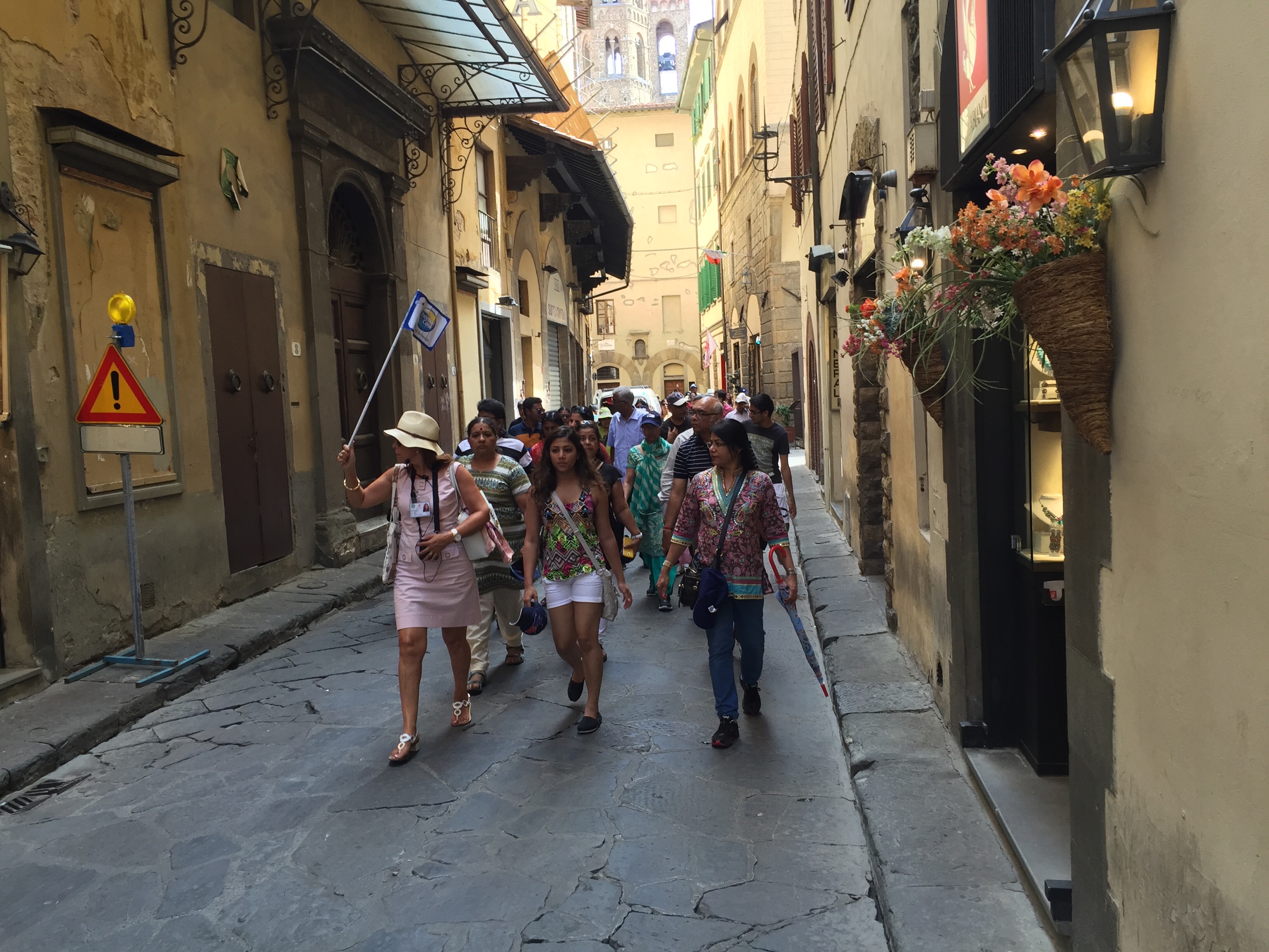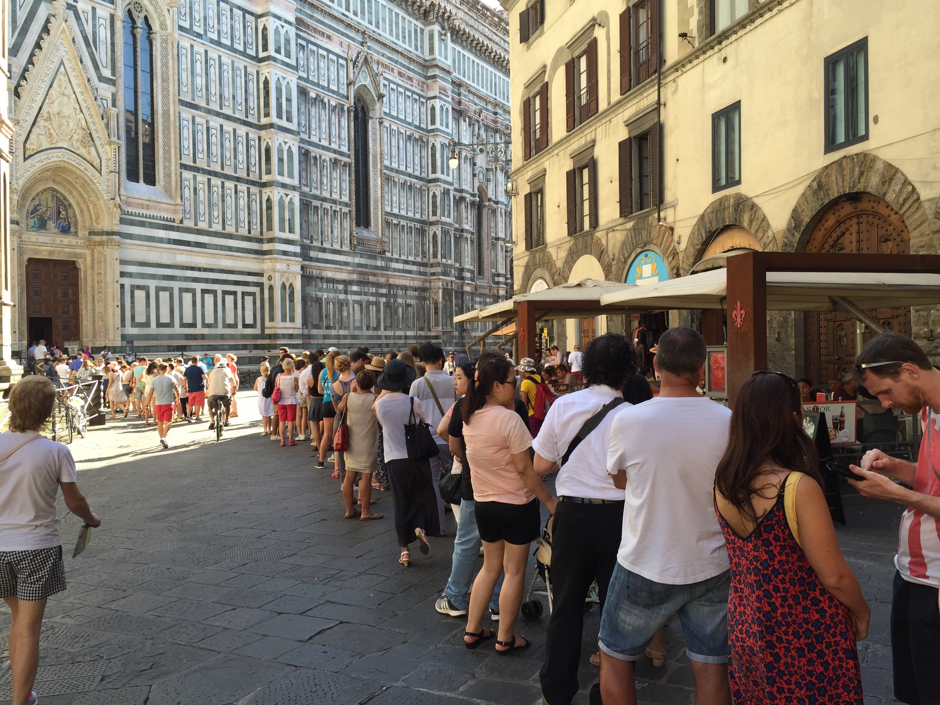What I did do at the Duomo, and the Piazza dei Signoria, and San Lorenzo, and everywhere else the guidebooks recommend you should go, is watch vast hordes of tourists being rushed from site to site by group leaders with flags, like the souls before the Gates of Hell.