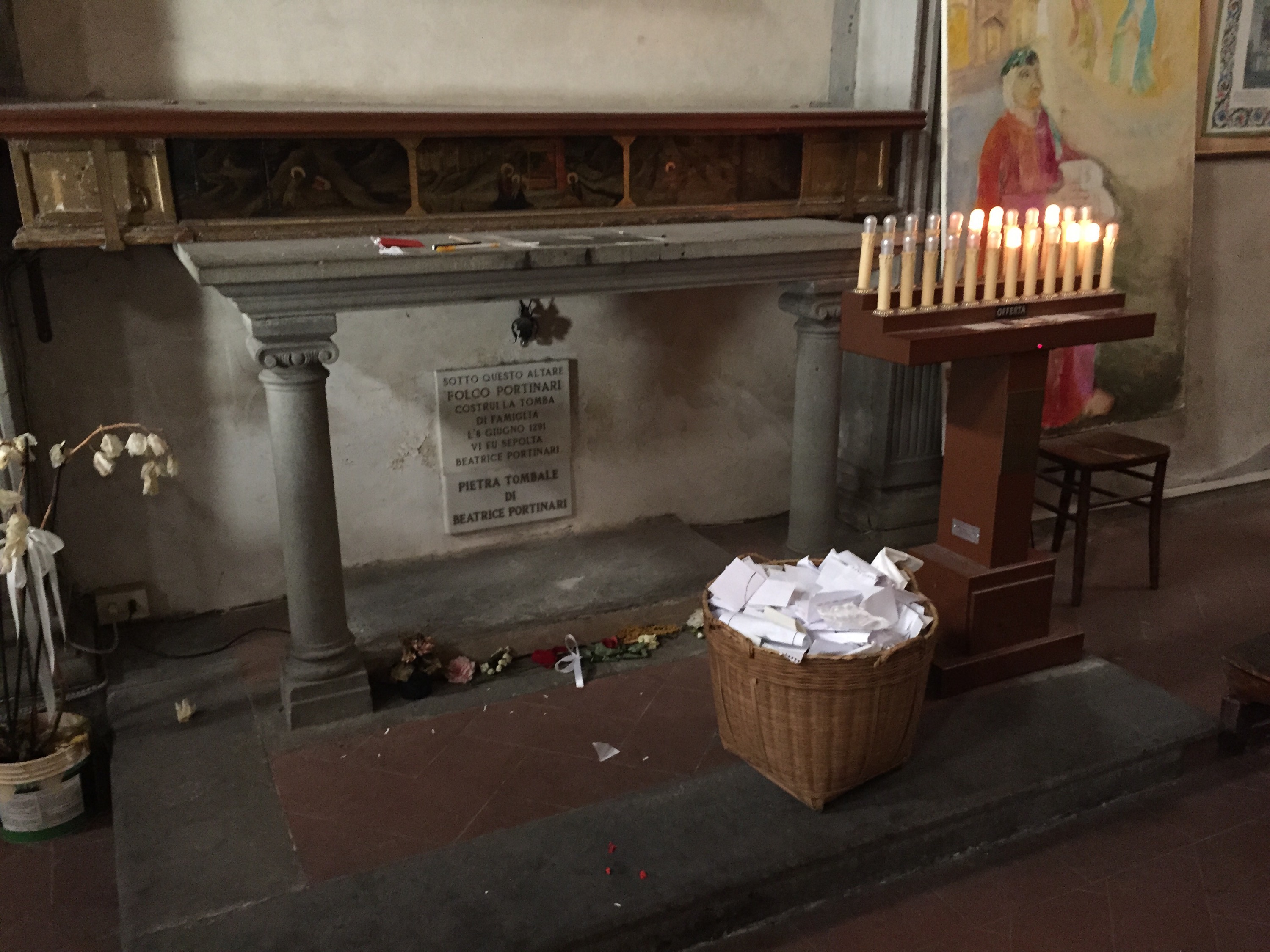 There was a crypt that may or may not have contained Beatrice’s mortal remains. Certainly it belonged to the Portinari family. Above is a shrine to Mary, and in front many hand-written supplications, though to which lafy it is not clear (I didn’t look at any).