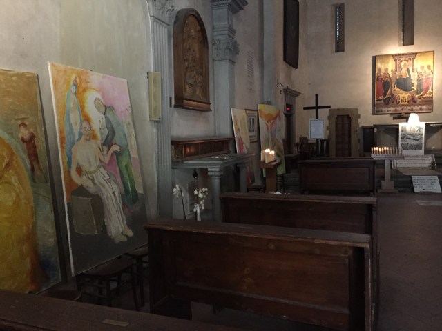 Inside, it’s probably the least church-like church in Florence: many contemporary paintings– bad ones– of Dante looking at Beatrice. Music was being piped in, and not historically appropriate music, such as Gregorian chant, or even particularly religious music, just some weird “beautiful” elevator music.