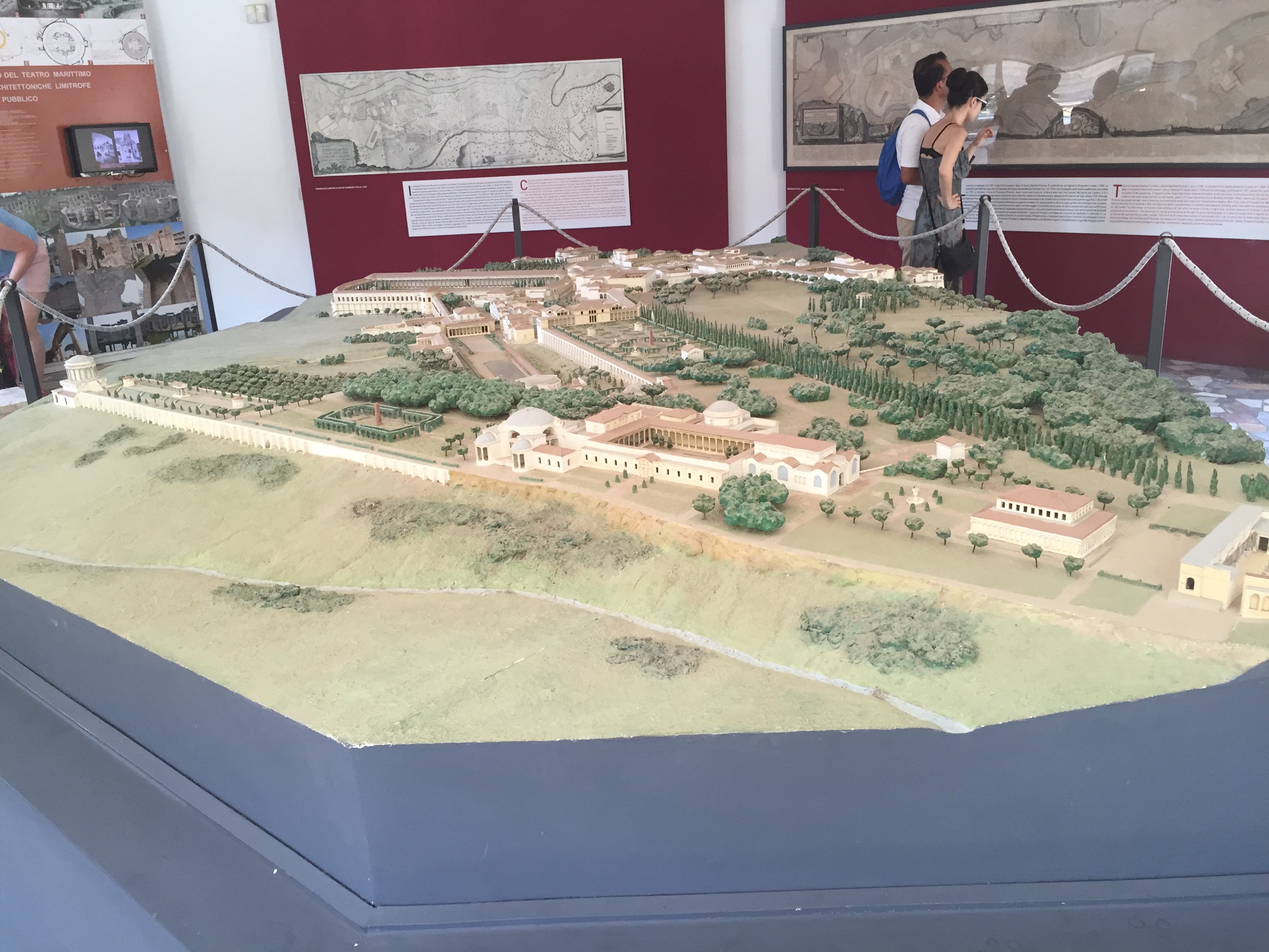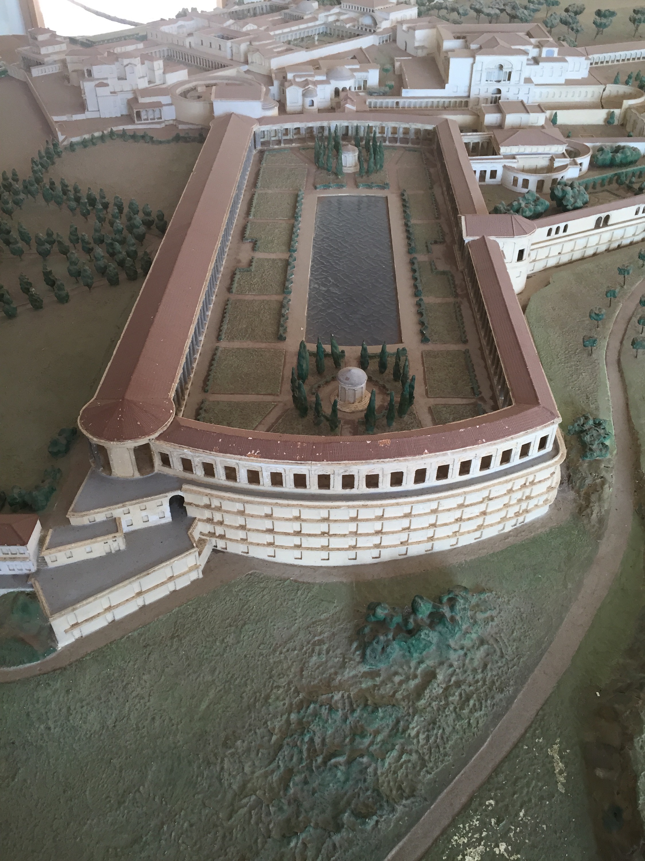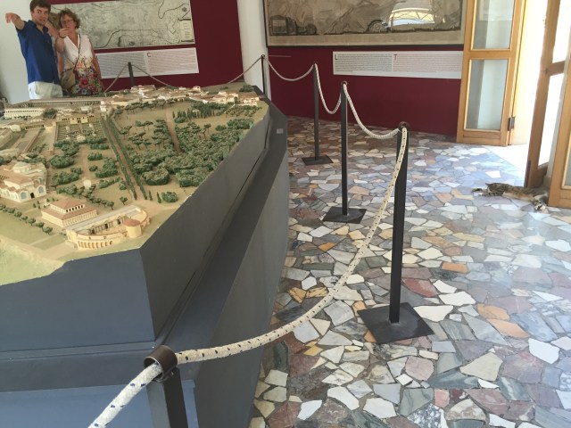 We arrive first to Plastico, the enormous plaster model of that the villa looked like in its prime. A sprawling complex of buildings, now all in ruins, it is hard to get your head around. It is also very, very hot, and the shade in the building together with the whirring fans are small comfort. By the door, a cat lounges. I ask the guard what is il nome del gatto? She doesn’t know, but it is a girl, she says. She thinks. “Sabina,” she decides, the name of Hadrian’s wife.