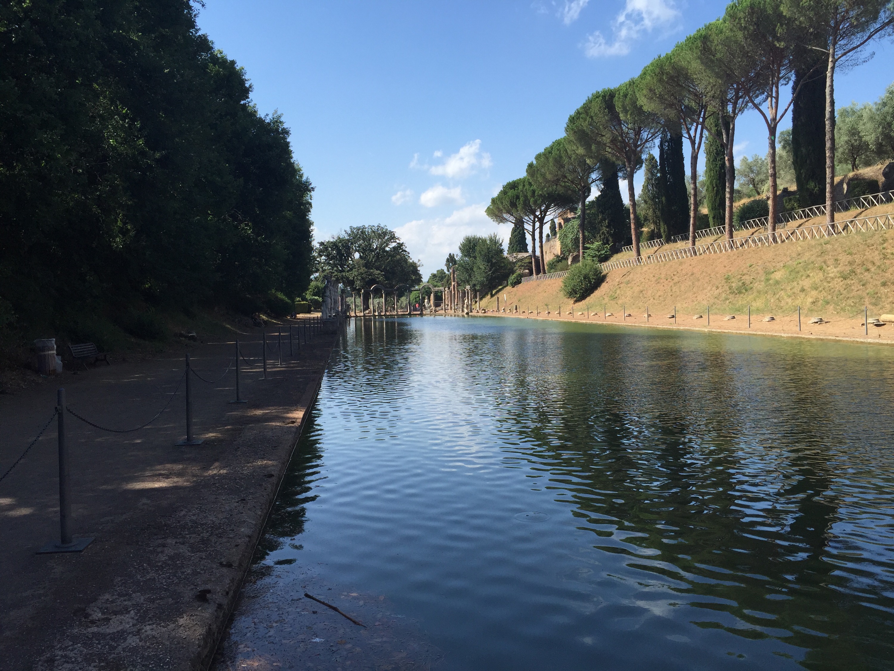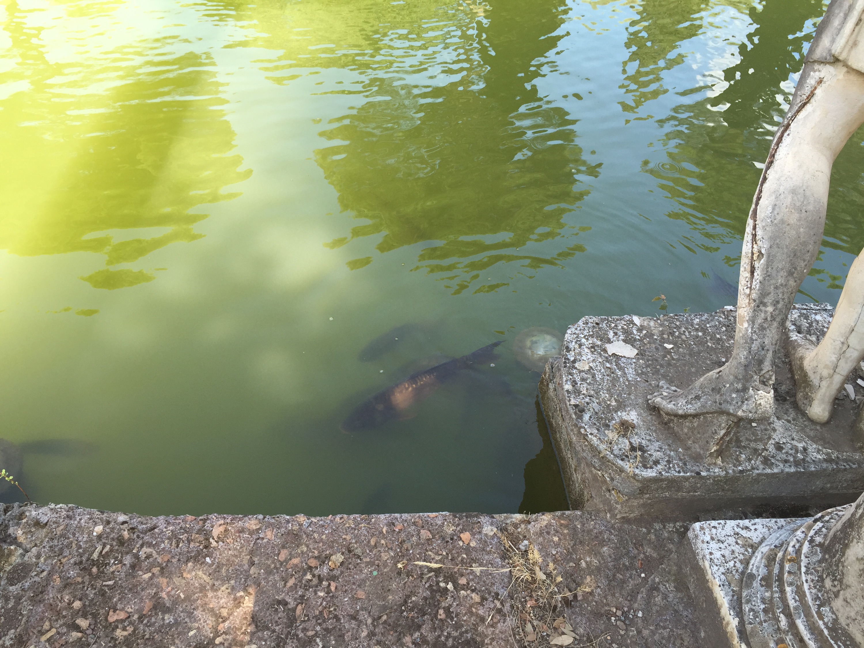 At the the Canopus, the long cylindrical pool surrounded by statues that was meant to conjure up a Roman version of the Nile, the shade and water bring relief. Unsurprisingly, many visitors are gathered here, not just to get their breath but also to feed the fish. A turtle’s head emerges now and again by the crocodile statue on the far side.