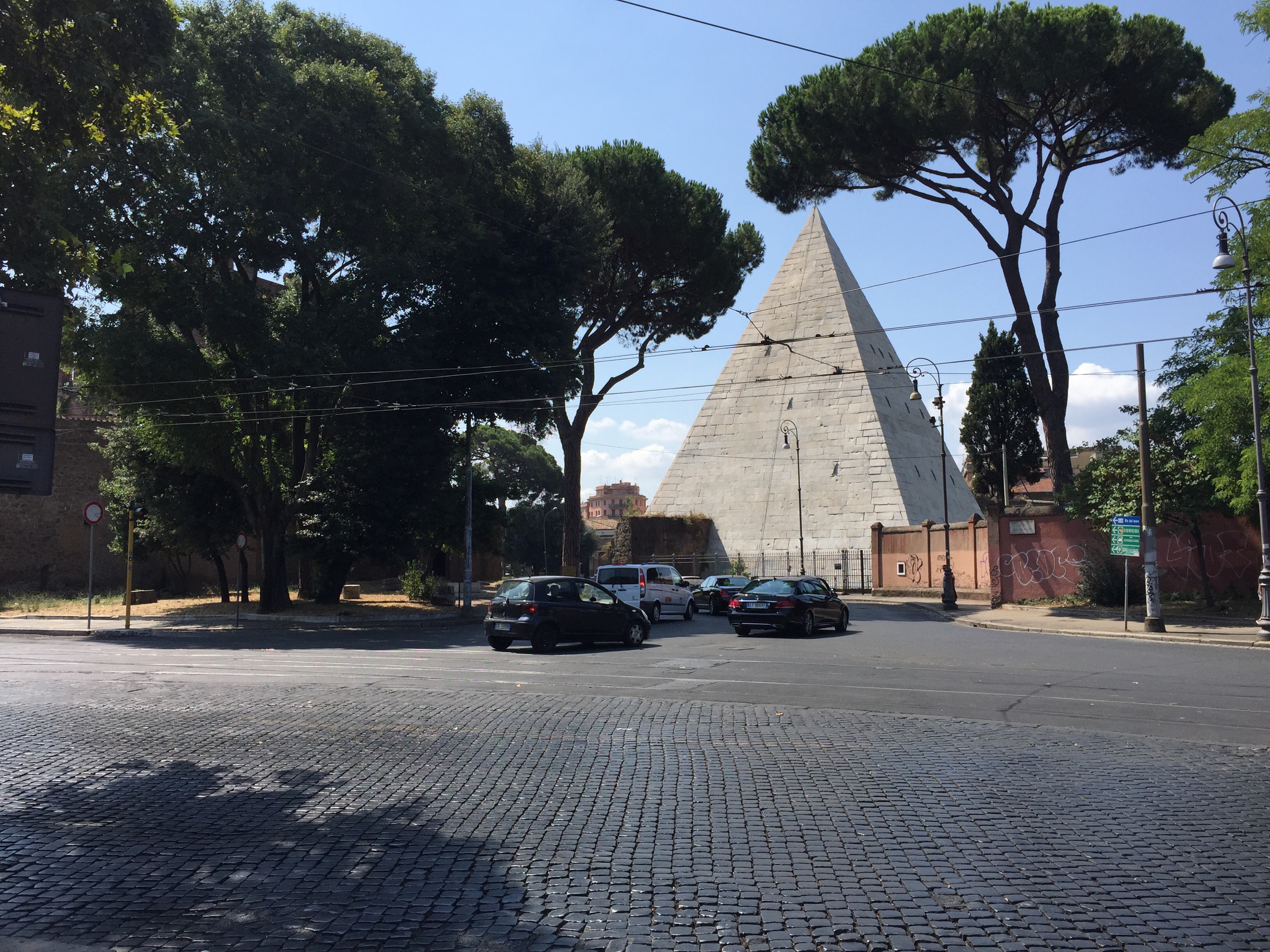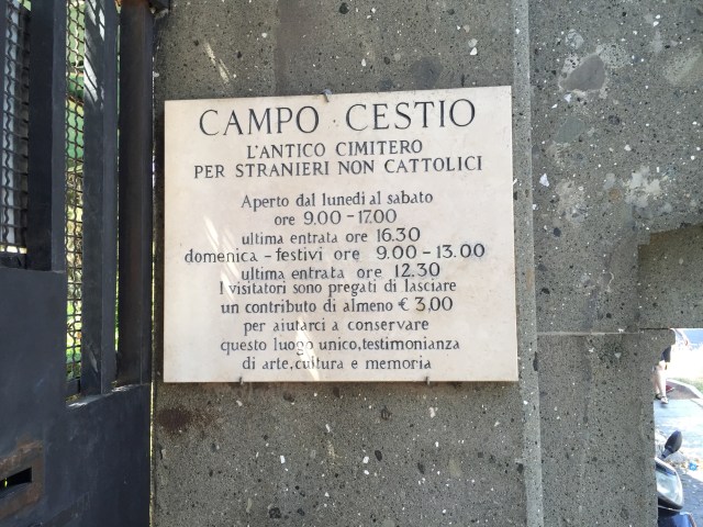 The pyramid of Cestius, built in the first century, is the first thing you see when you get off the bus at Porta San Paolo in Testaccio. Crossing the cobblestone street, you go down the road to the right to the entrance of Rome’s famous Protestant Cemetery, the final resting place since the early 19th century for much of the well-to-do Anglo-American ex-pat community