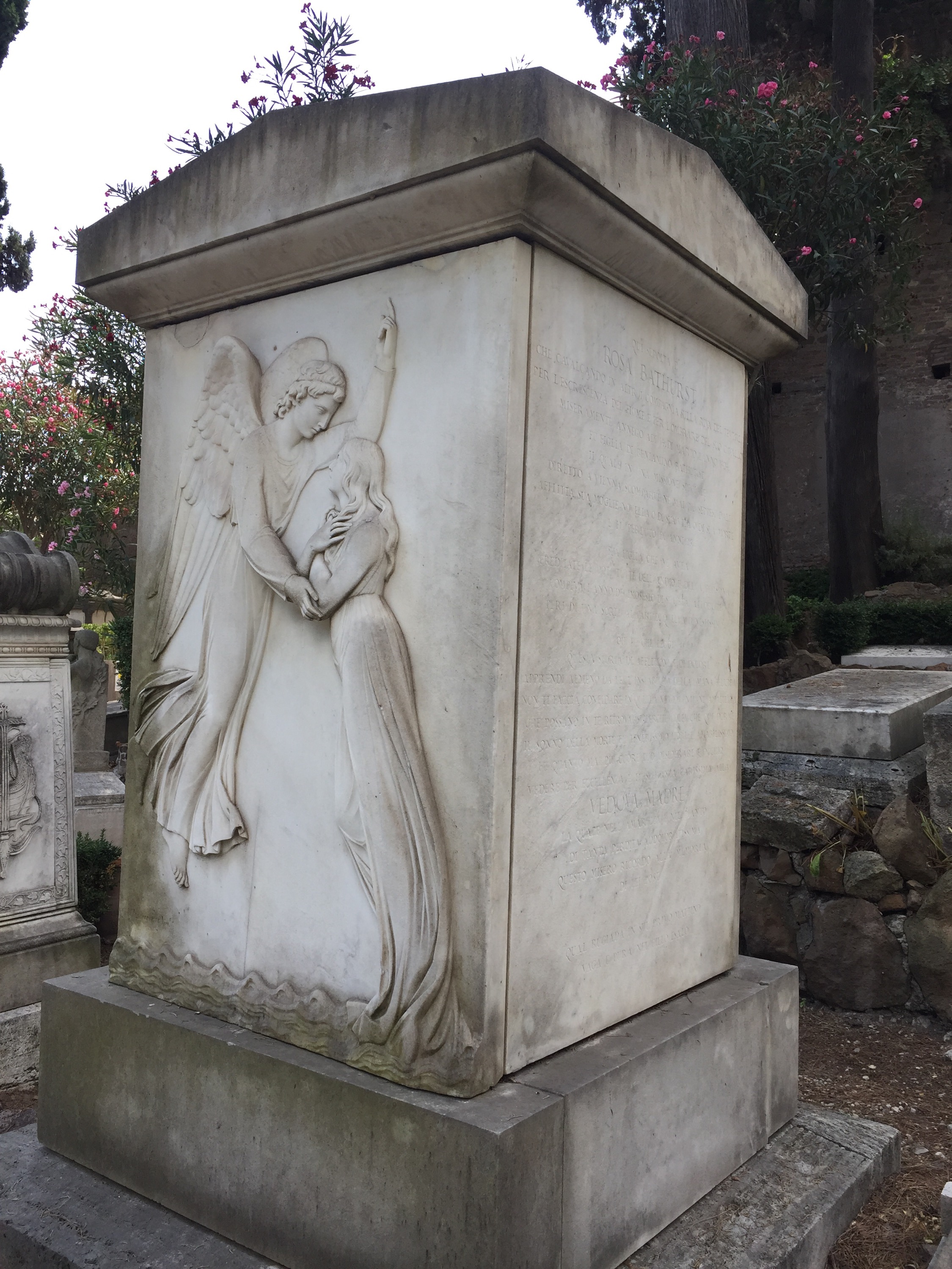 Entering the Campo Cestio is like stepping back in time, though not in the usual way you feel like you’ve stepped back in time in Rome. While it is true that there’s an ancient pyramid lurking to the left throughout your visit to the graveyard, the atmosphere is far more Romantic than Classical. Such a graveyard would not be out of place in England or older parts of the American East Coast–Mt. Auburn in Cambridge, perhaps, or Highgate in London. The sentimentality is thick on the ground here among the maudlin marbles.