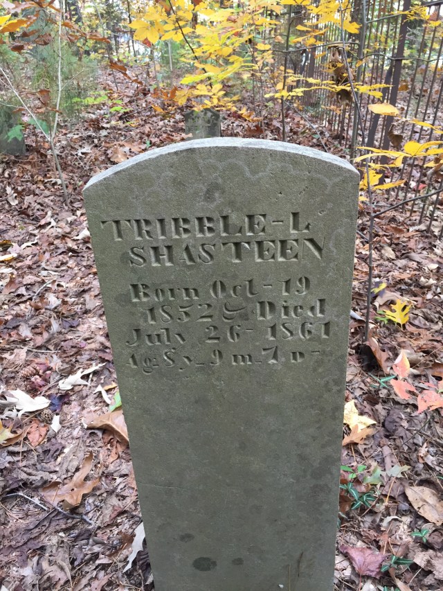 The TVA made a point of relocating old cemeteries that the flood would cover. The Shasteen cemetery, however, was on top of a high hill, and so was left in place. So while some of the people buried there were carried up by carriage, now you have to get there by canoe.