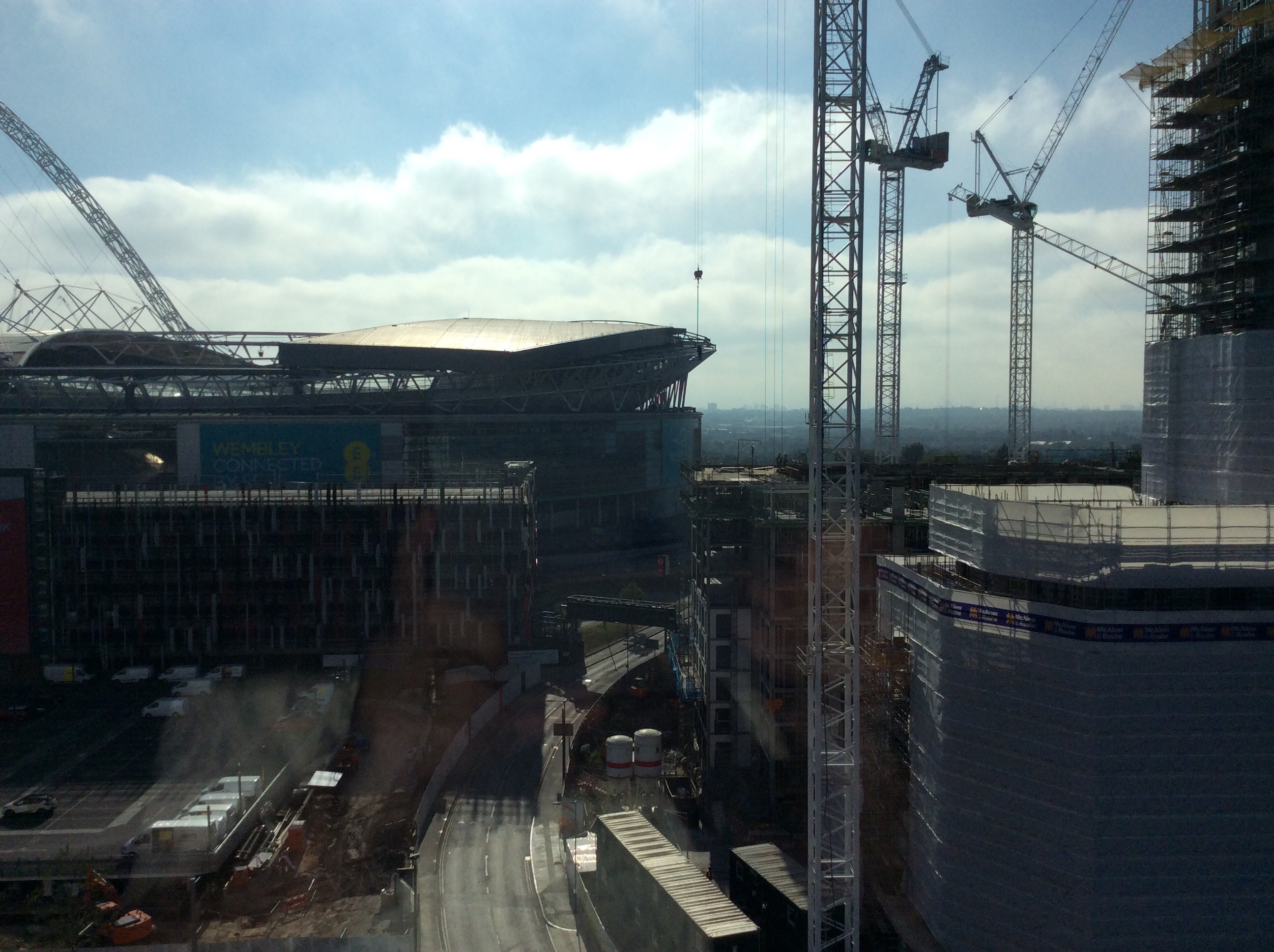 I’m co-teaching the Sewanee-in-England trip this summer, and in London we’re staying at the Ibis Hotel just by Wembley Stadium. It’s not the most glamorous view, but there’s something about all the construction (with its attendant clanging and banging) coupled with the overt modernity of the stadium itself that gives a distinct impression of the twenty-first century. In the next few days, I plan to add to this post with thoughts on what it’s like to be in the shadow of the modern Colosseum. For now, however, a picture taken from my window as I sipped my morning coffee will suffice: