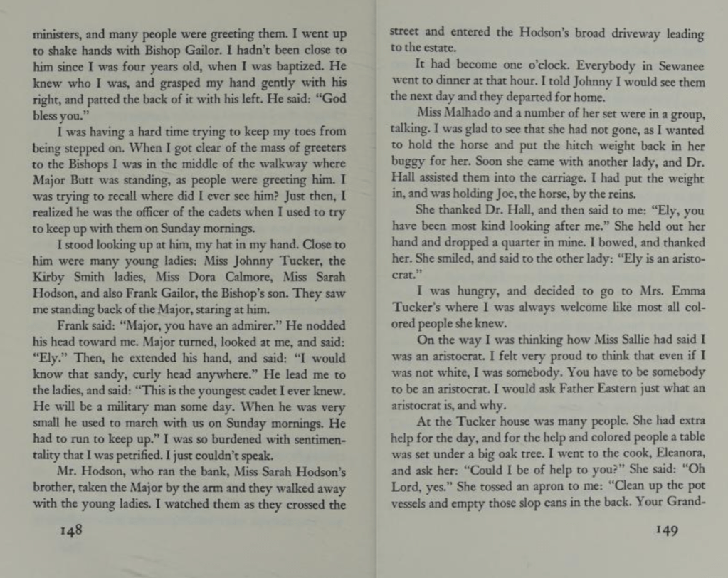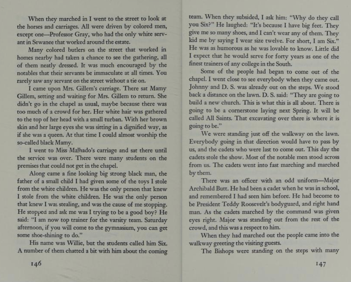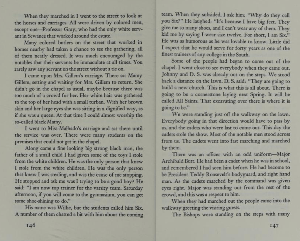 Major Archibald Butt, whom I have mentioned a few times before on this blog– here and here— was a famous son of Sewanee, and so it is no surprise that he should be mentioned by another famous son, Ely Green, in his memoir, the long version of which is called Too Black, Too White, and a shorter Sewanee-focused version called Ely: An Autobiography (accessible on internet archive at this link). I have copied the selections where Butt is mentioned below.